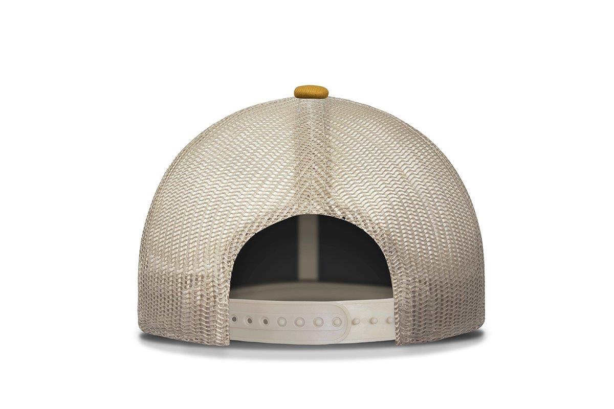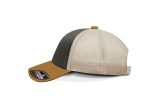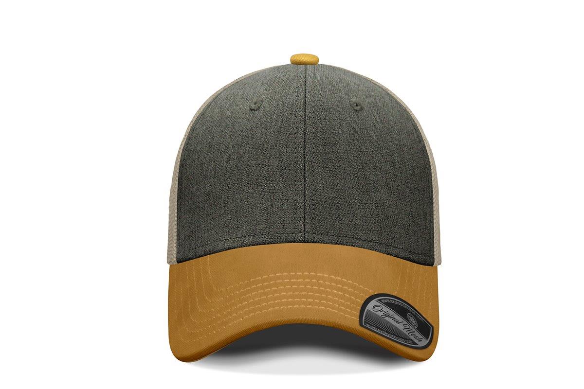 Inicio Colores Gris Obscuro Jaspe Gorra Pólvora, Frente Gris Obscuro Jaspe, Visera Amarillo Trigo, Trasero Arena